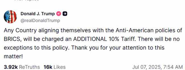 ट्रम्प यांनी ट्रुथ सोशलवरील पोस्टमध्ये लिहिले आहे की, "जो कोणताही देश ब्रिक्सच्या अमेरिकाविरोधी धोरणांसोबत जाईल, त्याच्यावर १०% अतिरिक्त जकात आकारली जाईल. या धोरणाला कोणताही अपवाद असणार नाही. या प्रकरणी लक्ष दिल्याबद्दल धन्यवाद!" असे ट्रम्प यांनी आपल्या पोस्टमध्ये लिहिले. ट्रम्प यांनी अतिरिक्त कराची धमकी दिली असली तरी अमेरिकाविरोधी धोरण कोणती याबाबत स्पष्ट केलेले नाही.