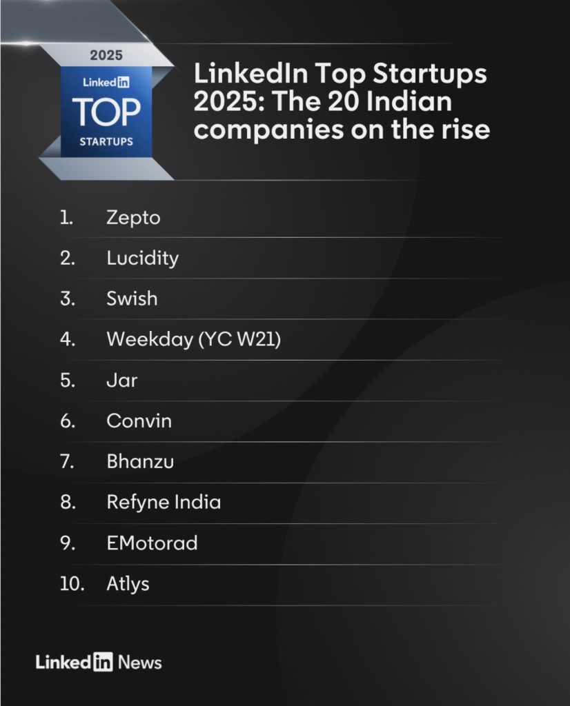 भारत:जगातील सर्वात मोठ्या व्यावसायिक नेटवर्कपैकी एक लिंक्डइनने २०२५ लिंक्डइन टॉप स्टार्टअप्स इंडिया लिस्टचे अनावरण केले आहे. करिअर वाढवू शकणाऱ्या उदयोन्मुख कंपन्यांची वार्षिक रँकिंग कंपनीने जाहीर केली. कर्मचाऱ्यांची वाढ, गुंतवणूकीची आवड, नोकरीची आवड आणि टॉप टॅलेंट च्या आकर्षणावरील विशेष लिंक्डइन डेटावर आधारित, या वर्षीची यादी नोकरी शोधणाऱ्यांना संधी ओळखण्यास मदत करू शकणाऱ्या अंतर्दृष्टी समोर आणते. क्विक-कॉमर्स युनिकॉर्न झेप्टो सलग तिसऱ्या वर्षी यादीत आ घाडीवर आहे, त्यानंतर एंटरप्राइझ क्लाउड स्टोरेजची पुनर्परिभाषा करणारी ल्युसिडिटी दुसऱ्या क्रमांकावर आणि बेंगळुरूस्थित १०-मिनिट फूड डिलिव्हरी प्लॅटफॉर्म स्विश तिसऱ्या क्रमांकावर आली आहे.कंपनीने क्रमवारी स्पष्ट करताना वेगवेगळ्या श्रेणींमध्ये का म करत असूनही, तिन्हीही कंपन्या वेगाने वाढत आहेत आणि नवीन बाजारपेठांमध्ये विस्तारत आहेत. क्रमवारीत हे दर्शविते की ऑपरेशनल अचूकता, तंत्रज्ञानाची खोली आणि श्रेणीतील चपळता हे भारतातील सर्वोत्तम कामगिरी करणाऱ्या स्टार्टअप्सचे निश्चित फा यदे आहेत.