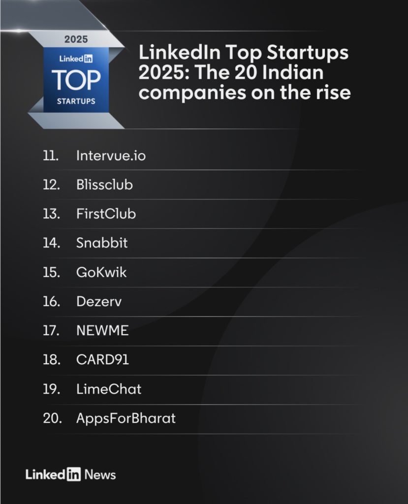 तुम्ही लिंक्डइन इंडिया २०२५ टॉप स्टार्टअप्सची यादी येथे पाहू शकता. https://www.linkedin.com/pulse/linkedin-top-startups-2025-20-indian-companies-rise-zckwc?utm_source=share&utm_medium=member_ios&utm_campaign=share_via