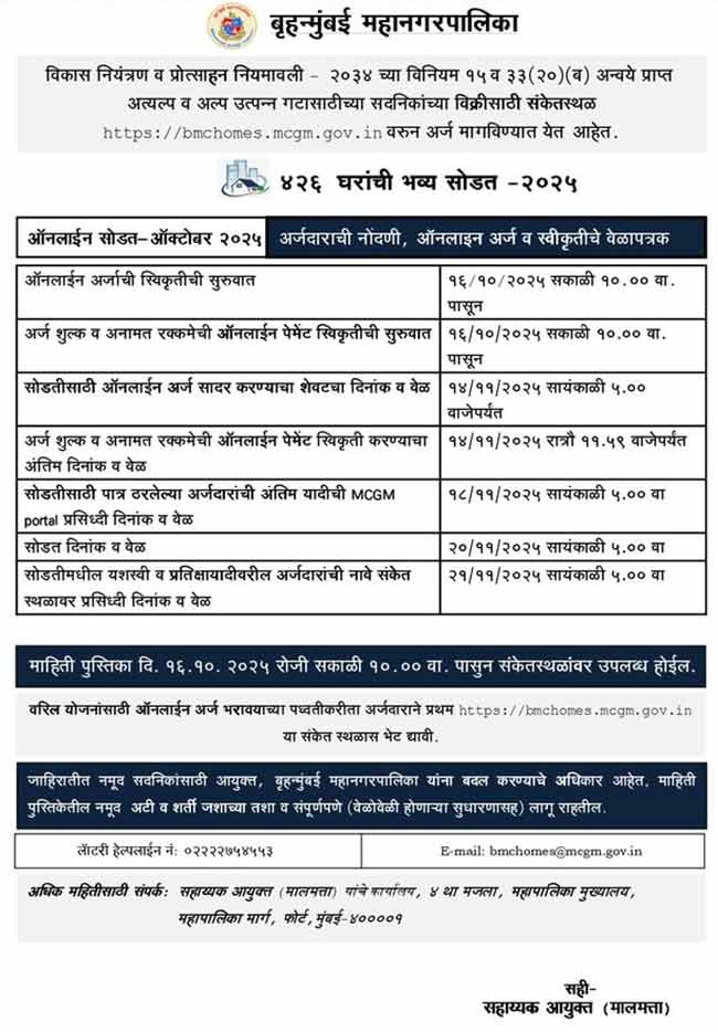 आतादेखील मुंबई महापालिकेकडून ४२६ फ्लॅट्सचे वाटप करण्यात येणार आहे. हे वाटप लॉटरी पद्धतीने करण्यात येणार आहे. विकास नियंत्रण आणि प्रोत्साहन नियमावलीनुसार या फ्लॅट्सचं वाटप केलं जाणार असल्याची माहिती आहे. विशेष म्हणजे या ४२६ घरांसाठी अर्ज दाखल करण्यास सुरुवात देखील झाली आहे.