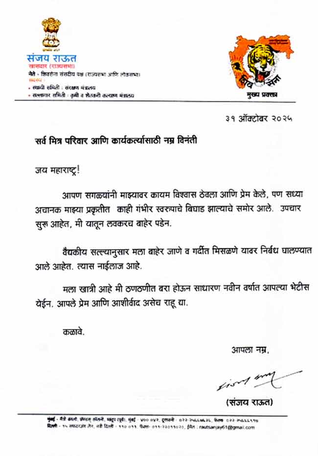 राऊत यांनी आपल्या पत्रात चाहत्यांना आणि कार्यकर्त्यांना माहिती दिली की, त्यांच्या प्रकृतीमध्ये गंभीर बिघाड झाल्यामुळे डॉक्टरांनी त्यांना बाहेर जाणे आणि गर्दीत मिसळण्यावर निर्बंध घातले आहेत. नेमकं काय झालं आहे, याचा खुलासा त्यांनी केलेला नाही. मात्र, या अनपेक्षित घडामोडीमुळे ते उद्याच्या (दि. १) महाविकास आघाडीच्या 'सत्याच्या मोर्चा'लाही उपस्थित राहणार नसल्याचे स्पष्ट झाले आहे. तसेच, त्यांची दररोज सकाळी होणारी पत्रकार परिषदही आता होणार नाही.