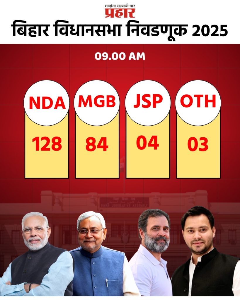 पाटणा : बिहारमध्ये विधानसभेच्या २४३ जागांसाठी ६ आणि ११ नोव्हेंबर असे दोन टप्प्यात मतदान झाले. आता मतमोजणी सुरू आहे. आतापर्यंत हाती आलेले कल बघता एनडीएला बहुमत मिळाल्याचे दिसत आहे. बिहारमध्ये पुन्हा एकदा एनडीएची सत्ता येत असल्याचे बघून महागठबंधन चिंतेत आहे. आतापर्यंत आलेल्या कलानुसार बिहारमध्ये एनडीए १६५, महागठबंधन ७३, जनसुराज पार्टी ३ आणि इतर २ जागांवर आघाडीवर आहेत. बिहारमध्ये बहुमताचा जादुई आकडा १२२ आहे. एनडीएने तर १५० चा टप्पा ओलांडला आहे. यामुळे एनडीएची स्थिती भक्कम आहे.   बिहारमध्ये ७४.२ दशलक्ष नोंदणीकृत मतदार आहेत. यात ३९.२ दशलक्ष पुरुष आणि ३५ दशलक्ष महिला आहेत. विधानसभेसाठी बिहारमध्ये पहिल्या टप्प्यात ६५.०८ टक्के आणि दुसऱ्या टप्प्यात ६८.७६ टक्के मतदान झाले.