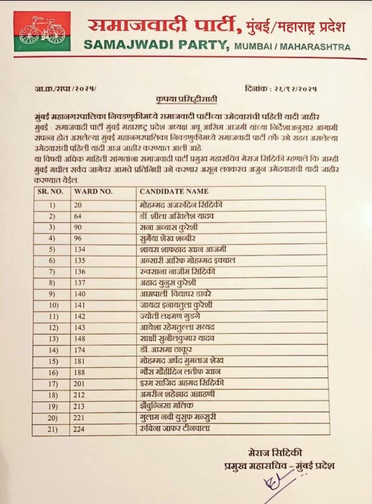 मुंबई : मुंबई महापालिकेच्या निवडणुकीसाठी समाजवादी पक्षाने उमेदवारांची पहिली यादी जाहीर केली आहे. या यादीत २१ जणांचा समावेश आहे. मुंबई महापालिकेत नगरसेवकांच्या एकूण २२७ जागा आहेत. या सर्व जागांसाठी १५ जानेवारी रोजी मतदान आणि १६ जानेवारी रोजी मतमोजणी आणि निकाल आहे.