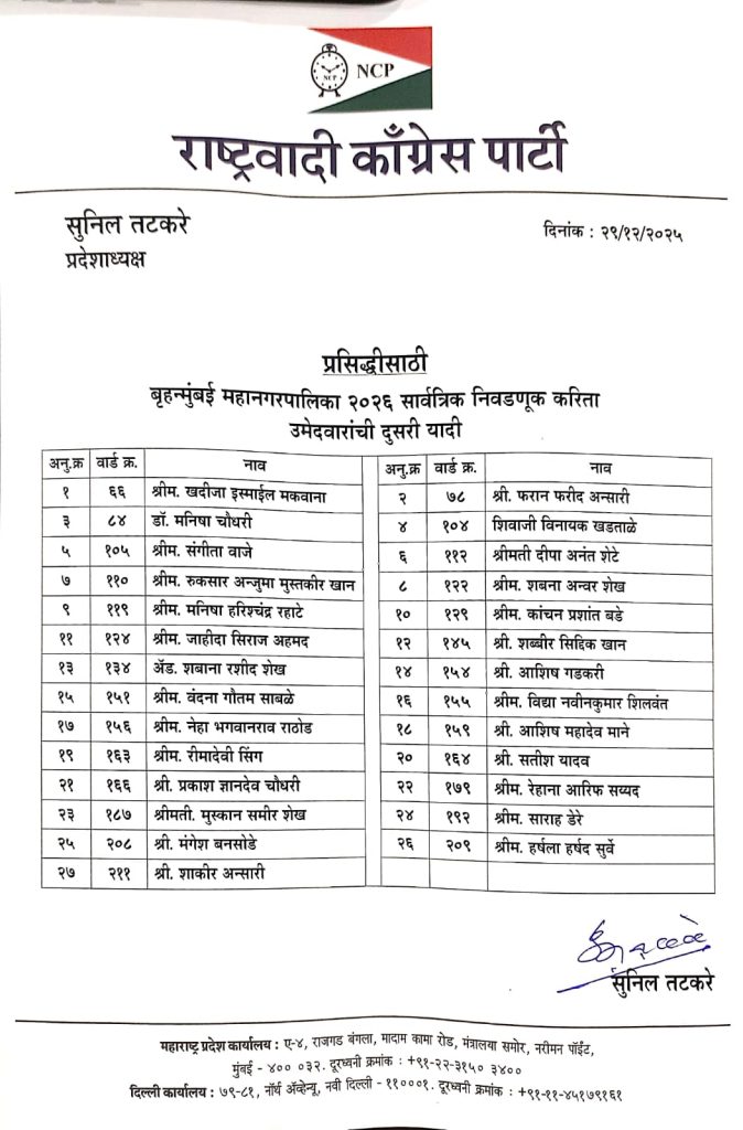 मुंबई : मुंबई महापालिका निवडणुकीसाठी राष्ट्रवादी काँग्रेसची दुसरी यादी जाहीर झाली आहे. यात २७ उमेदवारांचा समावेश आहे. याआधी राष्ट्रवादीने जाहीर केलेल्या पहिला यादीत ३७ उमेदवारांचा समावेश होता. यामुळे मुंबईसाठी राष्ट्रवादी काँग्रेसने दोन याद्यांच्या माध्यमातून एकूण ६४ उमेदवारांची घोषणा केली आहे. मुंबई मनपासाठी भारतीय जनता पार्टीने १०५ तर उबाठाने ४२ उमेदवारांना एबी फॉर्म दिले आहेत. या व्यतिरिक्त मुंबई मनपासाठी काँग्रेसने ८७, राष्ट्रवादी काँग्रेस शरदचंद्र पवार पक्षाने सात, राष्ट्रवादी काँग्रेसने ३७, समाजवादी पक्षाने २१, आम आदमी पार्टीने ५१, राष्ट्रीय समाज पक्षाने सहा उमेदवारांची पहिली यादी जाहीर केली आहे.