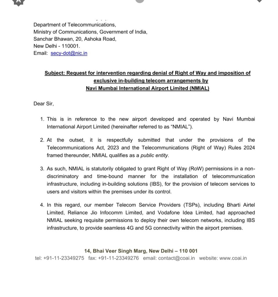 राईट ऑफ वे फ्रेमवर्क अंतर्गत सार्वजनिक संस्था असलेल्या NMIAL ला दूरसंचार कायदा, २०२३ आणि लागू RoW नियमांनुसार परवानाधारक टेलिकॉम ऑपरेटर कंपन्यांना आरओडब्लू परवानग्या देण्याचे निर्देश द्या अशी मागणी टेलिकॉम ऑपरेटर असोसिएशनने टेलिकॉम विभागाला केली आहे. त्यांच्या मते यामुळे विमानतळ परिसरात स्वतंत्र ४ जी व ५जी व आयबीएस (In Building Solution IBS) अशा पायाभूत सुविधा तैनात करता येतील. यासह मुख्य मागणीत असोसिएशनने नवी मुंबई आंतरराष्ट्रीय विमानतळावर नेटवर्क कव्हरेजच्या कमतरतेबद्दल परवानाधारक टेलिकॉम ऑपरेटर विरोधात विरुद्ध खोटे किंवा दिशाभूल करणारे आरोप करण्यापासून परावृत्त करण्याचे निर्देश द्या अशी मागणी त्यांनी पत्रात केली आहे. नवी मुंबई विमानतळ पीपीपी (पब्लिक प्रायव्हेट पार्टनरिशप) मॉडेल अंतर्गत यशस्वीपणे उभारण्यात आले आहे. अदानी एअरपोर्ट होल्डिंग्स लिमिटेड व सिटी इंडस्ट्रीयल डेव्हलपमेंट कॉर्पोरेशन यांच्या संयुक्त विद्यमाने या विमानातळाची कार्यवाही २५ डिसेंबरपासून सुरू करण्यात आली होती.