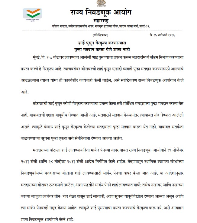 निवडणूक आयोगाने स्पष्ट केले आहे की, एखाद्या मतदाराने शाई पुसून पुन्हा मतदान केंद्रावर येण्याचा प्रयत्न केला, तरी त्याला पुन्हा मतदान करता येणार नाही. मतदाराने एकदा मतदान केल्यानंतर त्याची नोंद अधिकृतरीत्या केली जाते. त्यामुळे केवळ शाई पुसल्याने कोणीही दुसऱ्यांदा मतदान करू शकणार नाही, याबाबत सर्व निवडणूक केंद्रांना सतर्कतेच्या सूचना देण्यात आल्या आहेत.