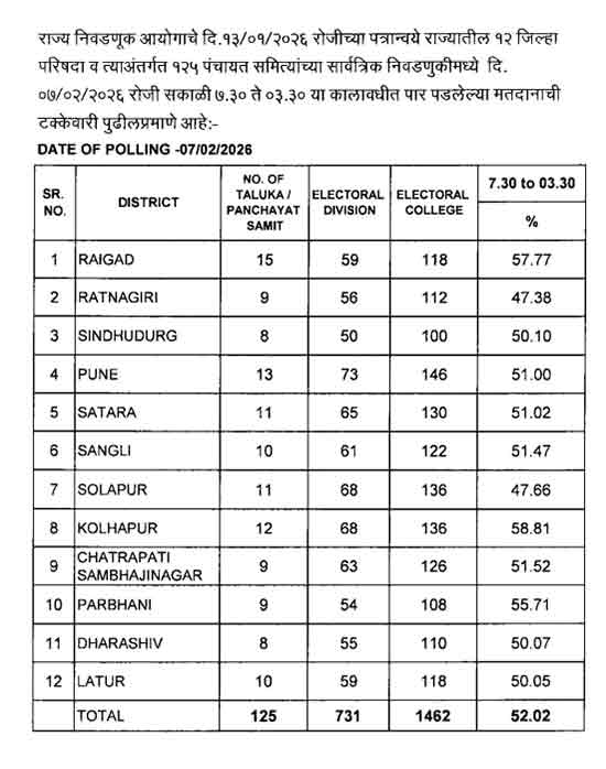 - जिल्हा परिषदा आणि पंचायत समित्यांसाठी राज्यात दुपारी साडेतीन पर्यंत ५२.०२ टक्के मतदान