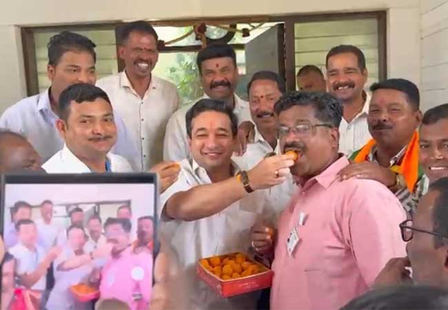 - भाजप – महायुतीची तळेरे पंचायत समितीचे उमेदवार राजेश जाधव व खारेपाटण पंचायत समितीचे उमेदवार गुरूप्रसाद शिंदे यांचे पालकमंत्री नितेश राणे यांनी ओम गणेश बंगल्यावर लाडू भरवून अभिनंदन केले.