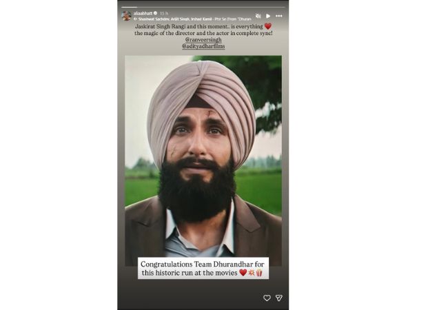 अभिनेत्री आलिया भट्ट रणवीर सिंहसोबत अनेक सिनेमांमध्ये झळकली आहे. नुकताच आलियानं आपल्या सोशल मिडियावर रणवीर सिंहच्या धुरंधर २ सिनेमाचं कौतुक केलं आहे. तसेच, याबरोबरच आलियानं धुरंधर २ सिनेमाचा एक फोटो शेअर केला असून याबरोबरच आलियानं लिहिलयं की 'जसकिरत सिंग रंगी' आणि हा क्षण हेच सर्वकाही आहे. अभिनेता आणि दिग्दर्शक यांच्यातील परिपूर्ण ताळमेळ हीच खरी जादू आहे. धुरंधर टीमचे अभिनंदन, चित्रपटसृष्टीतील हा एक ऐतिहासिक क्षण आहे.