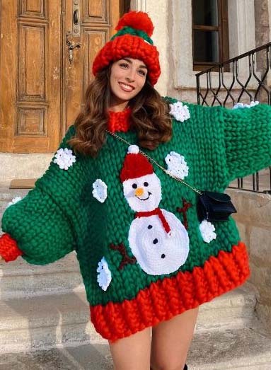 रेड किंवा ग्रीन स्वेटर, जीन्स आणि स्नीकर्स.